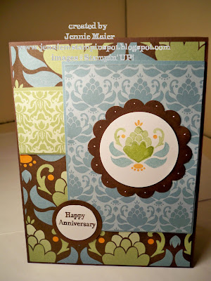 The base is Chocolate Chip then some DSP. There's also some Pear Pizzazz and Baha Breeze and more DSP. I colored the image from Friends Never Fade with the Baha Breeze, Pear Pizzazz and Pumpkin Pie Stampin' write markers, and then punched that out with the XL 1 3/4 inch Circle punch. That was then layered onto a Chocolate Chip piece punched with the XL 2 3/8 inch Scallop Circle punch. I also added some dots with the white gel pen. I used the Stamp-a-ma-jig to stamp "Happy Anniversary" from Teeny Tiny Wishes in Chocolate Chip on Whisper White. The 1 inch medium circle punch was used on that and then layered onto a piece of Chocolate Chip punched with the large 1 1/4 inch circle punch.